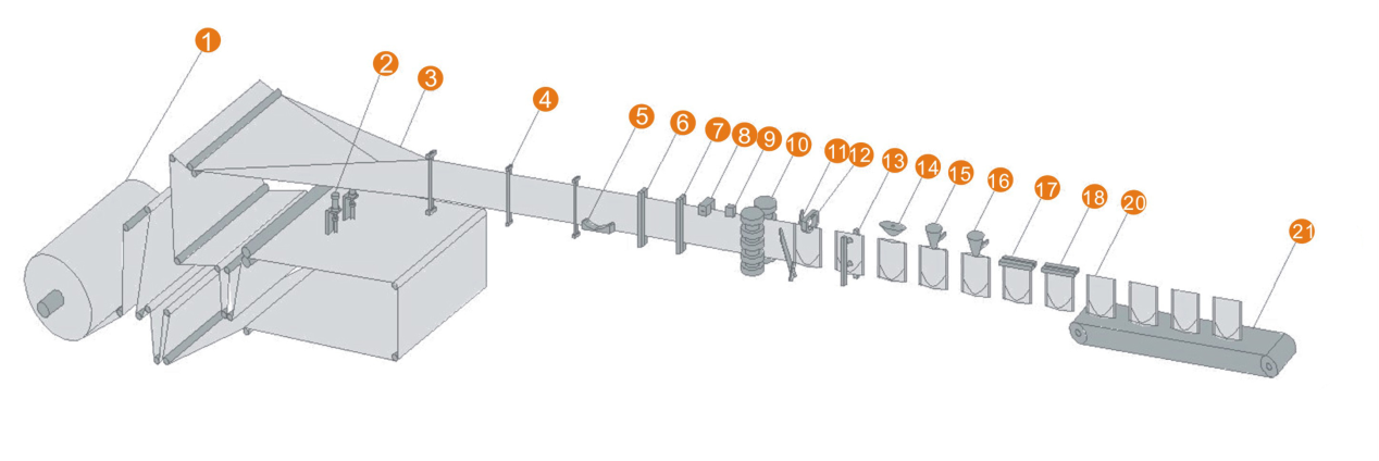 1.放拉鏈機構 2. 放膜機構 3. 底部沖孔 4.包裝膜成型 5. 包裝膜導向 6. 上封拉鏈 7. 底封機構 8. 豎封拉鏈機構 9. 豎封機構I 10. 豎封機構II 11.易撕口裝置 12.色標檢測 13. 伺服牽袋 14. 剪切機構 15. 夾袋 16. 開袋機構 17. 吹氣裝置 18. 充填I 19. 充填II 20. 展袋 21. 上封I 22. 上封II 23. 成品 24. 成品輸出