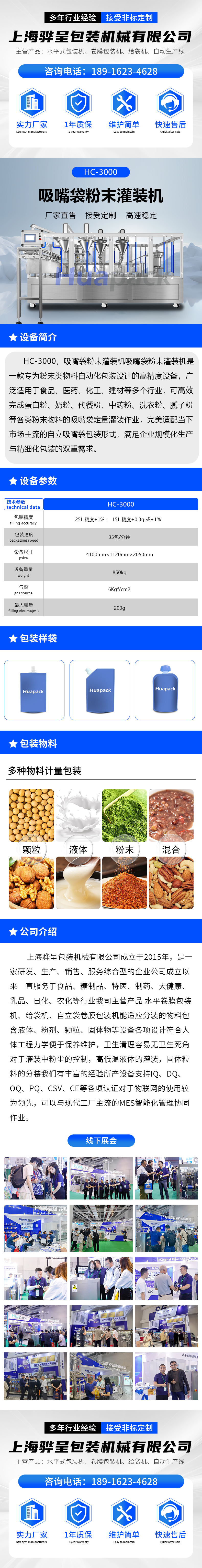HC-3000,吸嘴袋粉末灌裝機吸嘴袋粉末灌裝機是一款專為粉末類物料自動化包裝設(shè)計的高精度設(shè)備,廣泛適用于食品、醫(yī)藥、化工、建材等多個行業(yè),可高效完成蛋白粉、奶粉、代餐粉、中藥粉、洗衣粉、膩子粉等各類粉末物料的吸嘴袋定量灌裝作業(yè),完美適配當(dāng)下市場主流的自立吸嘴袋包裝形式,滿足企業(yè)規(guī)模化生產(chǎn)與精細(xì)化包裝的雙重需求。